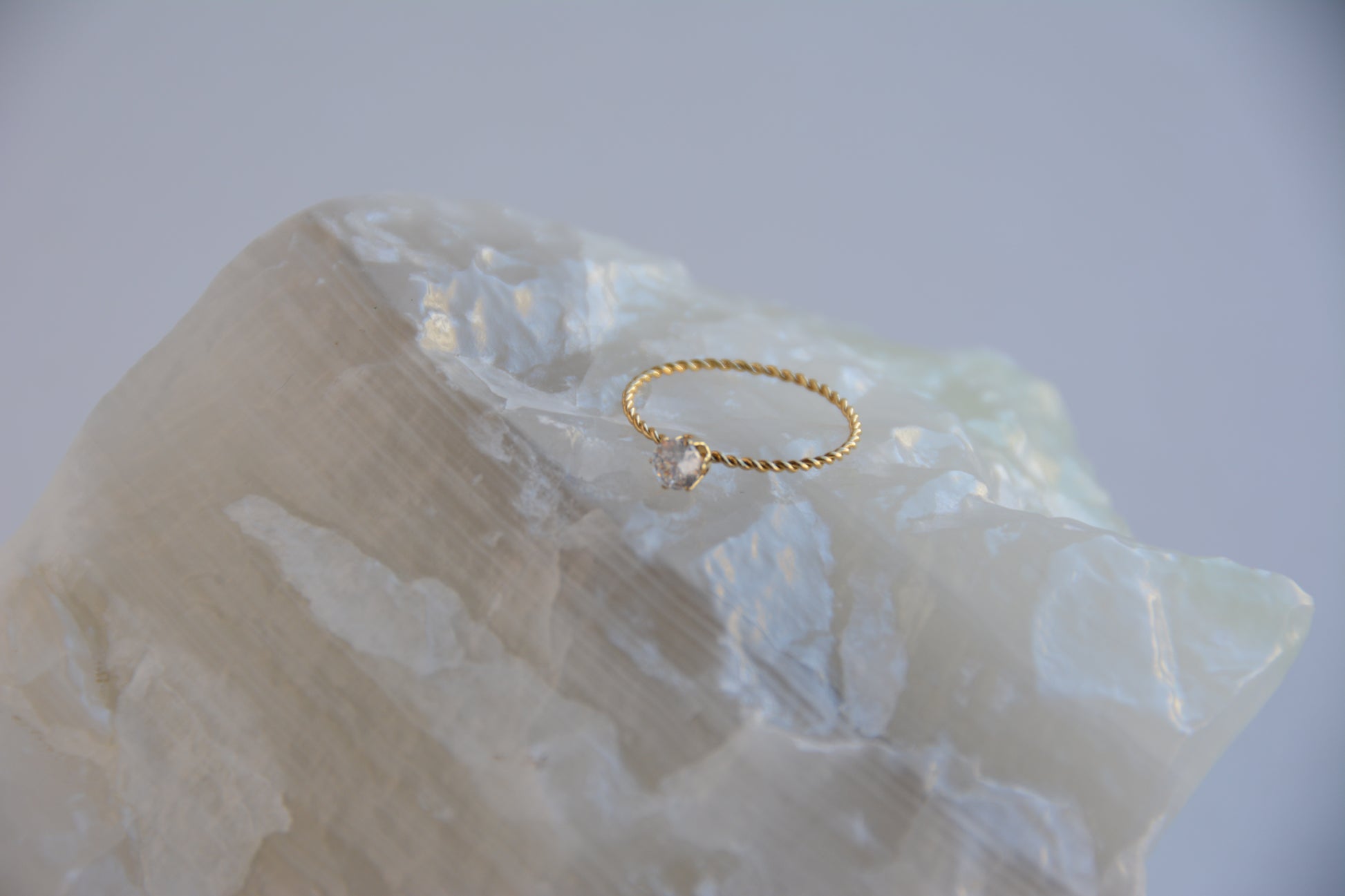 Elevate your look with the Sarah Ring, a luxurious accessory made with 14k gold plated stainless steel and featuring a charming twist detail. Its dainty size and minimal design make it a perfect piece for any ensemble.