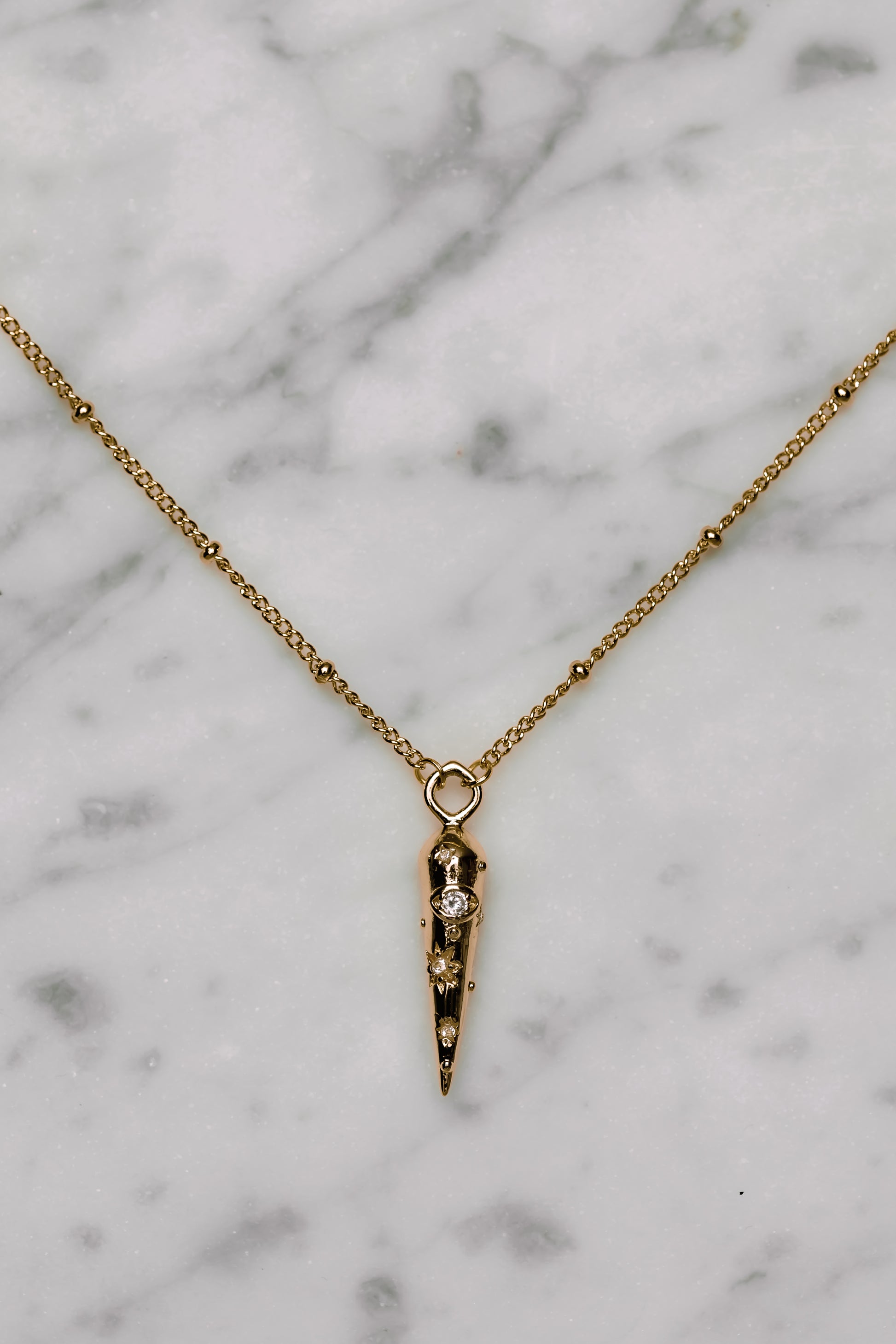 Introducing the Serena Pendant Necklace, a must-have for any luxurious and exclusive fashion collection. Crafted from titanium steel with 18k gold plating, this unique piece boasts edgy and gorgeous details. Perfect for stacking or wearing on its own, it's the ultimate statement piece that exudes elegance and sophistication. Elevate your style with the Serena Pendant Necklace.
