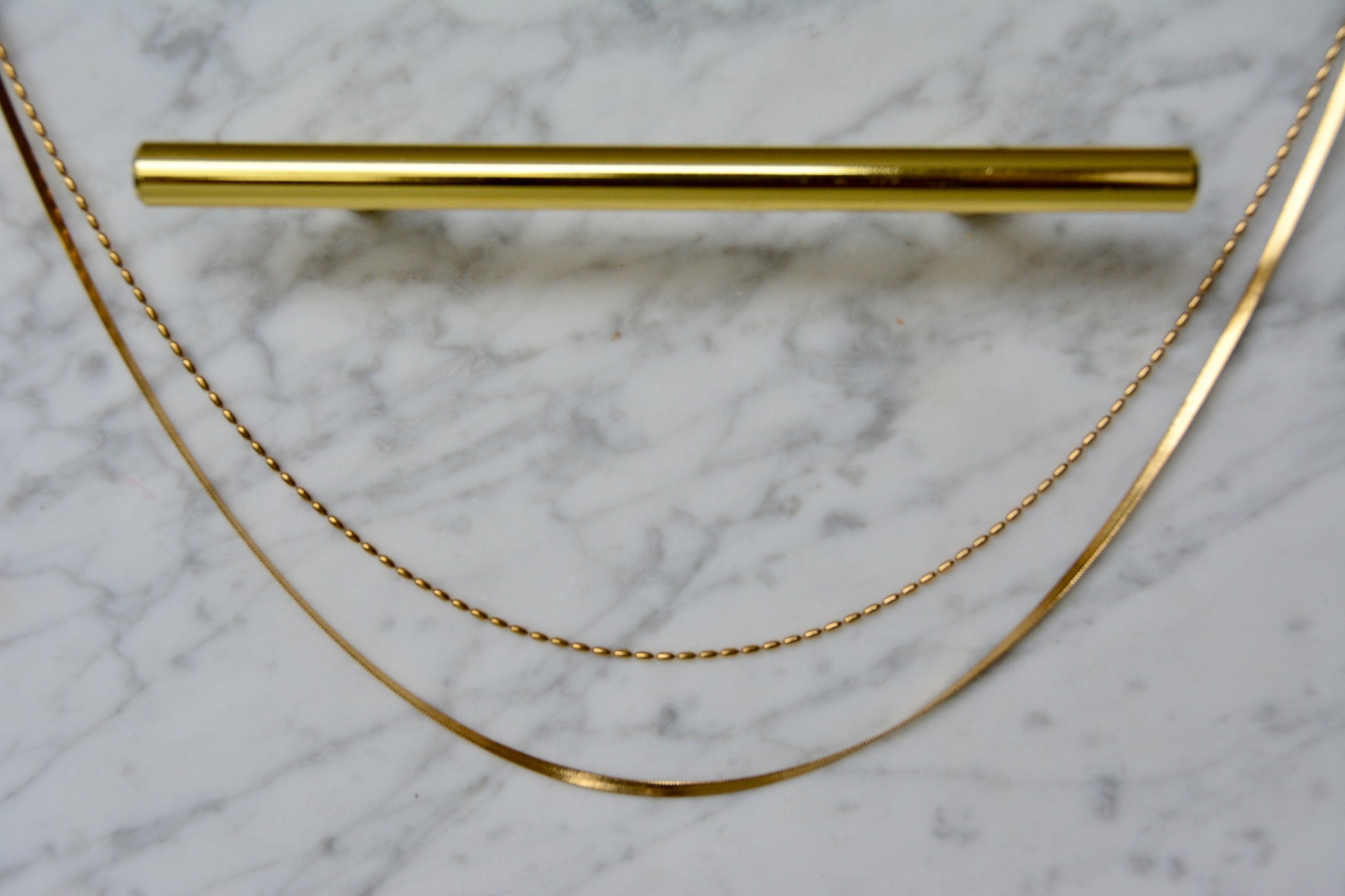 Create a stunning layered look with our Snakebone Stack. This unique piece features a double chain with a smooth herringbone and snakebone design, crafted from durable titanium steel with 18k gold plating. Elevate your style with this sophisticated and exclusive addition to your accessory collection.